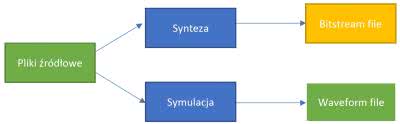 Cykl projektowania możemy podzielić na dwa odrębne etapy (rysunek 2): symulacja, w wyniku której powstaje wynikowy plik, zawierający diagram przebiegów wyjściowych; synteza, tworząca w rezultacie plik bitstream, który może być wykorzystany do zaprogramowania pamięci konfigurującej układ FPGA.