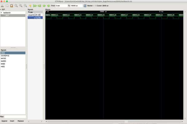 Pierwsza komenda dokonuje kompilacji plików źródłowych do kodu pośredniego, w wyniku której powstaje plik blink.vvp, stanowiący kod dla maszyny wirtualnej vvp. Druga komenda uruchamia maszynę wirtualną, która wykonuje plik blink.vvp, w efekcie czego, zgodnie z zawartością pliku blink_tb.v, powstaje plik zawierający diagramy, będące efektem symulacji. Tak powstały plik możemy otworzyć bezpośrednio w programie GTKWave, w efekcie czego ujrzymy przebiegi wewnątrz projektowanego układu (rysunek 3). W programie służącym do przeglądania przebiegów możemy wybrać interesujące nas sygnały i przeglądać je w całości lub oglądać ich fragmenty.