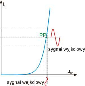 Kąt przepływu prądu przez element czynny wzmacniacza klasy A jest równy 360°. Oznacza to, że tranzystor musi być przez cały czas pracy utrzymywany w stanie aktywnym, a więc musi przez niego płynąć prąd, nawet w stanie spoczynku, czyli bez sygnału sterującego. Ze względu na minimalizację zniekształceń nieliniowych punkt pracy tranzystora (PP) powinien być obierany na liniowym odcinku charakterystyki Ic=f(Ube) (rysunek 1). Może się to wiązać z koniecznością przepuszczania względnie dużego prądu spoczynkowego. Działanie wzmacniacza klasy A sprawdzimy na prostym przykładzie. Podobny problem był już rozpatrywany w 1. odcinku cyklu, w którym zajmowaliśmy się wzmacniaczem w konfiguracji OE (WE, wspólny emiter). Obliczenia nie są jednak skomplikowane, szybko więc je powtórzymy. Schemat wzmacniacza zamieszono na rysunku 2.