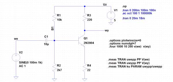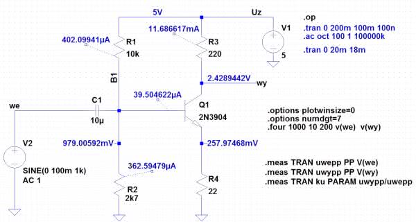 Teraz sprawdzimy parametry wzmacniacza dla prądu zmiennego. W celu określenia wzmocnienia napięciowego wprowadzamy trzy polecenia: