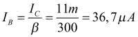 Z charakterystyki tranzystora 2N3904 wynika, że dla prądu emitera 11 mA napięcie UBE jest równe 0,712 V. Napięcie na bazie wyniesie zatem UE+UBE=0,242+0,712=0,954 V. Na podstawie danych katalogowych przyjmujemy, że wzmocnienie prądowe zastosowanego tranzystora jest równe 300, co daje prąd bazy: