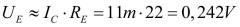 Przyjmujemy 220 Ω. Wzmocnienie jest równe w przybliżeniu stosunkowi rezystora kolektorowego do emiterowego, przy założonym wzmocnieniu rezystancja RE jest równa 22 Ω. Napięcie na emiterze wyniesie w przybliżeniu: