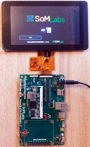 Po zainstalowaniu obrazu na karcie, możemy uruchomić przygotowany system na module VisionSOM-STM32MP1, podłączonym do płytki bazowej VisionCB-STM32MP1-STD. Jeżeli podłączony jest również wyświetlacz SL-TFT7-TP-800-480-P, to po uruchomieniu systemu zobaczymy aplikację demo, odtwarzającą plik wideo oraz zawierającą przycisk do włączania diody podłączonej do pinu PA11, a także suwak umożliwiający zmianę jej jasności (fotografia 1).