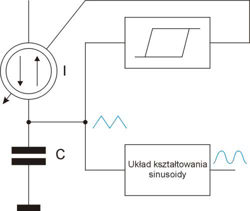 Mamy tu źródło prądowe, w którym może być zmieniane natężenie prądu oraz jego kierunek. Prąd tego źródła w zależności od kierunku ładuje lub rozładowuje kondensator C. Napięcie na kondensatorze jest równe: