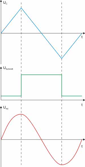Liniowo narastające napięcie kondensatora jest podawane na wejście przerzutnika Schmitta. Przyjmiemy, że jego wyjście po włączeniu zasilania jest w stanie niskim, co powoduje przepływ prądu w kierunku ładującym kondensator C. Po osiągnięciu górnego napięcia progowego następuje zmiana stanu wyjścia przerzutnika, wywołując tym samym zmianę kierunku przepływu prądu ze źródła. Od tego momentu kondensator jest stałoprądowo rozładowywany, a więc napięcie na nim maleje liniowo. Po przekroczeniu dolnego napięcia progowego ponownie następuje przerzut i zmiana kierunku przepływu prądu. Wracamy zatem do punktu wyjścia i jak widać, układ będzie generował napięcie trójkątne występujące na kondensatorze. Częstotliwość przebiegu zależy wyłącznie od prądu płynącego przez kondensator. Generator jest więc przestrajany poprzez zmianę wydajności źródła prądowego. Przebiegi w charakterystycznych punktach układu pokazano na rysunku 2. Nie będziemy się teraz szczegółowo zajmować poszczególnymi blokami takiego generatora. Mają one elementarną i dość prostą budowę.