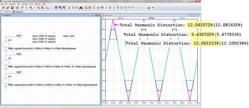 No nie. Raczej nie idźmy tą drogą, chociaż znane są aplikacje, w których takie podejście jest stosowane. Użytkownicy samochodów lubiący jeździć na biwaki w rejony nieucywilizowane prawdopodobnie mieli do czynienia z przetwornicami stałego napięcia akumulatorowego na napięcie zmienne stanowiące substytut napięcia sieciowego 230 V. W większości takich urządzeń generowane jest napięcie trapezoidalne zamiast sinusoidalnego i jak widać, podejście to sprawdza się w praktyce. Zobaczmy, jak bardzo przebieg trapezoidalny odbiega od sinusoidalnego. Zastosujemy oczywiście metodę symulacji. Wygenerujemy trzy przebiegi: trójkątny i dwa trapezoidalne. Aby sprawdzić, jak bardzo różnią się od czystej sinusoidy, zmierzymy zawartość harmonicznych. Sprawdzimy, jak na zwartość harmonicznych wpłynie poziom obcięcia wyjściowego przebiegu trójkątnego.