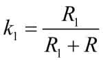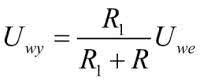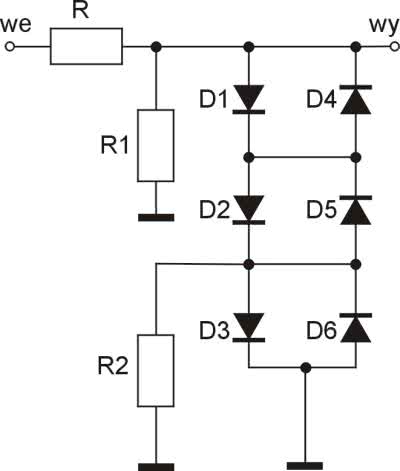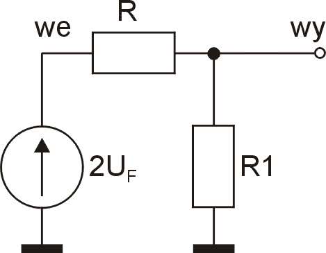 Dla małych napięć wejściowych wszystkie diody są wyłączone. W układzie istotne są tylko rezystory R i R1 (rysunek 6). Z rysunku 4 wynika, że pierwszy odcinek powinien mieć nachylenie k1=0,56 V/V. Taka więc powinna być transmitancja dzielnika R, R1.