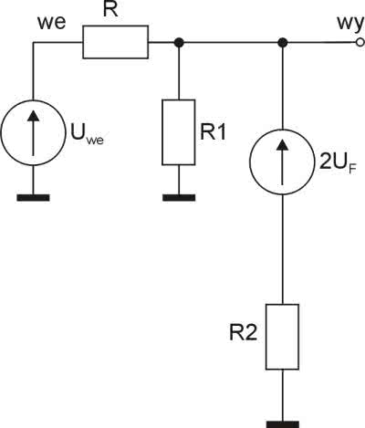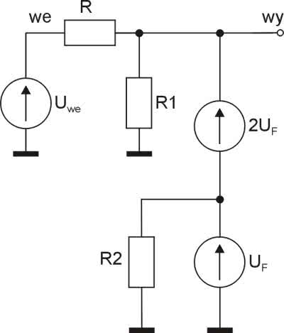 Zwiększając napięcie wejściowe, dochodzimy do momentu, w którym zaczynają przewodzić diody D1 i D2 (D4 i D5 dla napięć ujemnych). Dioda D3 jest bocznikowana rezystorem R2, więc aby weszła w stan przewodzenia, wymagane jest wyższe napięcie wejściowego. Przewodzące diody można traktować jak źródła napięciowe o napięciu UF. Schemat zastępczy dla tego przypadku jest pokazany na rysunku 7.