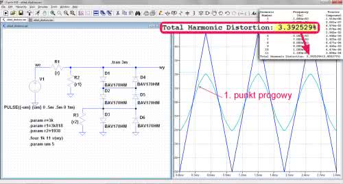 Amplitudę określono parametrycznie, aby możliwe było łatwe badanie jej wpływu na przebieg wyjściowy. Domyślnie jest opisana jako: .param um 5, a więc ma wartość 5 V. Wejściowy przebieg trójkątny ma czas narastania 0,5 ms i czas opadania 0,5 ms. Okres tego przebiegu jest równy 1 ms, co odpowiada częstotliwości 1 kHz. Przebieg wyjściowy ma kształt zbliżony do sinusoidy, ale można dość wyraźnie zaobserwować 1. punkt progowy odpowiadający napięciu wejściowemu nieco ponad 2 V.