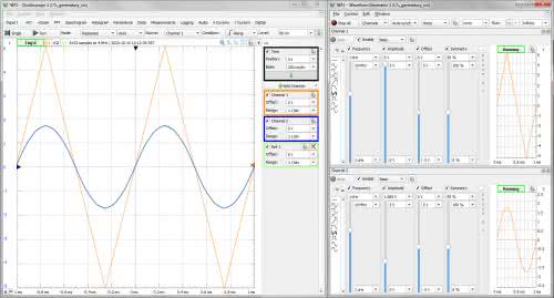 Rzeczywisty układ budujemy dokładnie według schematu z symulacji. W testowanym układzie znalazły się wyciągnięte z głębokiego lamusa diody BAVP17 (może BAVP19). Źródłem wejściowego przebiegu trójkątnego jest 1. kanał generatora arbitralnego. Ustawiamy amplitudę 5 V i częstotliwość 1 kHz. Rezystory R1 i R2 w układzie pomiarowym zostały zastąpione potencjometrami wieloobrotowymi, na których ustawiono wartości wynikające z obliczeń. Uruchamiamy generator i oscyloskop. Wyniki pokazano na rysunku 12. Dla lepszej weryfikacji wzrokowej przebiegu wyjściowego, kanał 1. oscyloskopu został na chwilę dołączony do 2. kanału generatora arbitralnego generującego sinusoidę wzorcową. Oscylogram sinusoidy wzorcowej zapisujemy jako przebieg referencyjny. Amplitudę sygnału generatora dobrano tak, aby obie sinusoidy – wzorcowa i wytwarzana w układzie kształtującym – pokryły się ze sobą. Porównanie wizualne wypada nieźle. Widać jednak, że sinusoida układu kształtującego nie osiąga przewidzianej w obliczeniach amplitudy 1,95 V.
