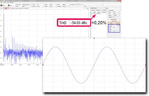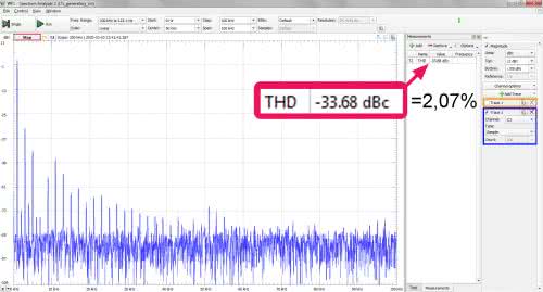 Dokładniejsza ocena jakości przebiegu wymaga pomiaru współczynnika zniekształceń harmonicznych. Jest to możliwe za pomocą narzędzia Spectrum Analyzer zestawu Analog Discovery 2. Otwieramy go i ustawiamy parametry pomiaru: Top=10 dBV, Bottom=–109 dBV, aktywny pomiar Trace 2 – Channel C2, Freq. Range=100 kHz to 122.1 Hz, Start=0 Hz, Stop=100 kHz, Scale=Linear. Uaktywniamy ponadto pomiar Trace2→Dynamic→THD.