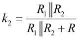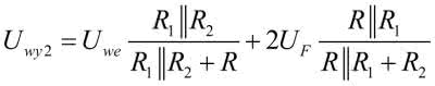 Dla lepszej czytelności uwzględniono tylko elementy dla dodatnich napięć wejściowych. Ponieważ w obwodzie występują dwa źródła napięciowe, do obliczenia napięcia wyjściowego korzystamy z zasady superpozycji. Ostatecznie jest ono równe: