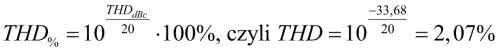 Wynik pomiaru pokazano na rysunku 13. Zawartość harmonicznych jest podawana w jednostkach dBc. Do przeliczenia na procenty korzystamy z zależności: