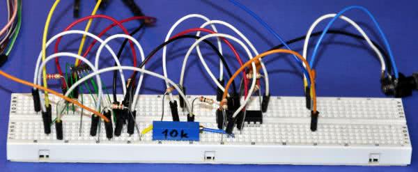 Układ tradycyjnie montujemy na breadboardzie (fotografia 1). Źródłem sygnału akustycznego w układzie rzeczywistym jest 1. kanał generatora arbitralnego Analog Discovery 2. Ustawiamy w nim częstotliwość 440 Hz, amplitudę 2 V, offset 2,5 V, przebieg sinusoidalny. Sygnał kluczujący jest generowany w kanale 2. Tym razem wybieramy przebieg prostokątny o częstotliwości 1,6667 Hz, amplitudzie 2,5 V, offsecie 2,5 V i współczynniku wypełnienia 16,667%. Parametry te odpowiadają tym, które przyjęto w symulacji: „kropka” trwa 100 ms, „kreska” 500 ms. Aby nie komplikować układu nie uwzględniono w nim wzmacniacza słuchawkowego. Zastosowano jedynie kondensator separujący składową stałą. Wyjście za tym kondensatorem można dołączyć do dowolnego wzmacniacza akustycznego. W układzie modelowym wykorzystano do tego gniazdko słuchawkowe i przewód zakończony wtykiem jack 2,5 mm. Masę gniazdka połączono z rzeczywistą (nie sztuczną) masą układu.