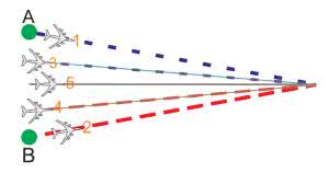 Nawigator samolotu 1 (rysunek 1) będzie słyszał tylko kropki, nawigator samolotu 2 usłyszy tylko kreski. Nawigatorzy samolotów 3 i 4 będą słyszeć zarówno kreski, jak i kropki, przy czym w samolocie 3. głośniejsze będą kropki, a w samolocie 4. kreski. Nawigatorzy tych samolotów muszą informować pilotów o konieczności korekty kursu. Samoloty 1. i 3. muszą odbić w prawo, a samoloty 2. i 4. w lewo. Tylko samolot nr 5 leci dokładnie na cel. Jego nawigator słyszy w słuchawkach ciągły ton. Zakładając, że bombowce lecą dobrym kursem, pozostaje jeszcze ustalenie sposobu informowania załogi o momencie zrzutu bomb. Jest to jednak odrębny problem, którym nie będziemy się zajmować.
