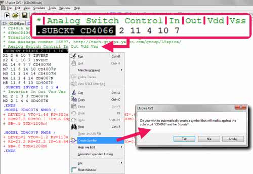 Do użycia klucza CD4066 konieczne jest jeszcze zdefiniowanie jego symbolu graficznego wstawianego do schematu. Najwygodniejszą metodą jest skorzystanie z możliwości automatycznego utworzenia symbolu. W tym celu otwieramy w edytorze LTspice plik CD4066.sub, np. przeciągając go z menedżera plików do okna programu LTspice (rysunek 3), ustawiamy kursor na pierwszej linii pod komentarzem zawierającej frazę: .SUBCKT CD4066 i klikamy prawym przyciskiem myszki. Pojawia się menu, z którego należy wybrać polecenie Create Symbol. Program żąda jeszcze od nas potwierdzenia automatycznego wygenerowania symbolu klucza CD4066, na co oczywiście wyrażamy zgodę. Proponowany symbol ukazuje się na ekranie (rysunek 4). Można go zaakceptować bez zmian lub poddać edycji według własnych upodobań.