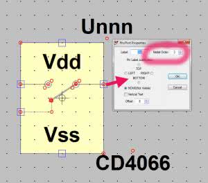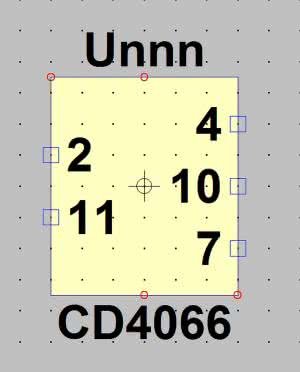 Praktycy zauważą, że w znalezionej bibliotece jest błąd w przyporządkowaniu wyprowadzeń do funkcji układu CD4066, co do celów symulacji nie ma znaczenia. Aby jednak nie wprowadzać w błąd Czytelników, którzy nie zaznajamiając się z artykułem od razu spróbują użyć elementu do symulacji, zmienimy nieco wygląd symbolu klucza. Wprowadzimy dodatkowe elementy graficzne, które jednoznacznie będą objaśniały funkcje poszczególnych wyprowadzeń. Nowy symbol pokazano na rysunku 5. Oznaczenia liczbowe widoczne w symbolu z rysunku 4 są jedynie etykietami i nie biorą udziału w tworzeniu listy połączeń tworzonego schematu. Istotne są natomiast numery porządkowe przypisane do poszczególnych pinów.