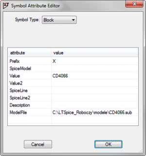 Jak widać na rysunku 5 w wyprowadzeniach zasilania pozostawiono widoczne etykiety, w pozostałych zostały ukryte. Po narysowaniu symbolu graficznego można go zapisać jako CD4066.asy. Jeśli symbol był tworzony z zastosowaniem funkcji automatycznej generacji, to plik zostanie zapisany w katalogu C:\....\LTspiceXVII\lib\sym\AutoGenerated. Po zapisaniu symbolu nie zamykamy jeszcze edytora, gdyż do używania tak zdefiniowanego elementu, konieczne jest jeszcze określenie kilku atrybutów. Przeznaczone do tego celu okno edycyjne jest wywoływane np. naciśnięciem kombinacji Ctrl-A. (rysunek 6). Obowiązkowo należy wypełnić pola: