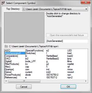 Symbol klucza umieszczamy na schemacie naciskając przycisk F2, co powoduje wyświetlenie standardowej biblioteki elementów LTspice. Nasz klucz został umieszczony w katalogu [AautoGenerated] (rysunek 7). Pełny schemat pokazano na rysunku 2.