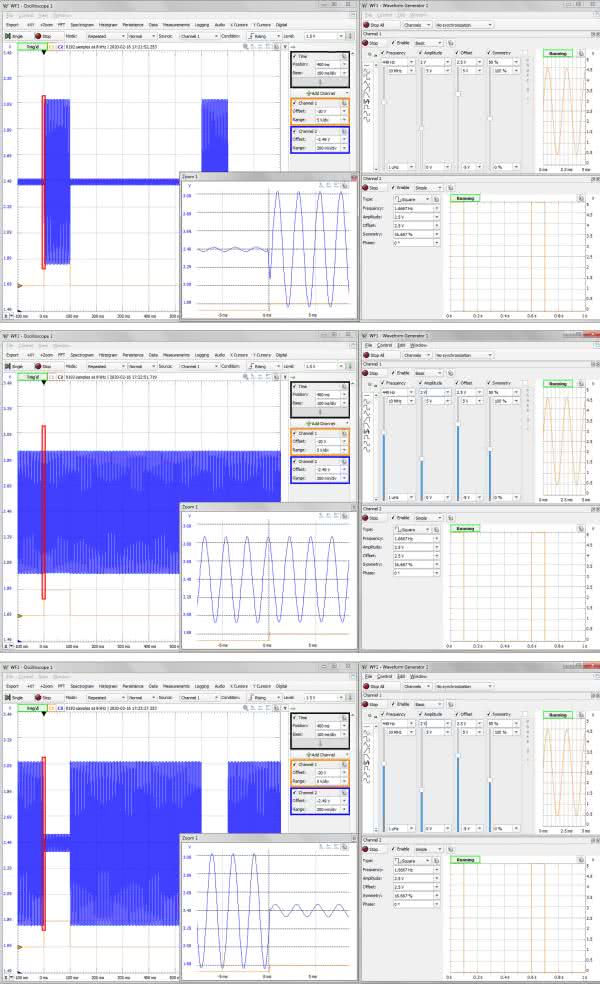 W poleceniu .wave RAF_s_0_50.wav 16 44.1k V(wy1) zawarta jest proponowana nazwa pliku (zamieniając ją warto uwzględnić frazę opisującą nastawę potencjometru – w powyższym przypadku 0,50). Pozostałe parametry określają rozdzielczość próbkowania (16 bitów) i częstotliwość próbkowania (44,1 kHz). Ostatni parametr tego polecenia określa węzeł, z którego pobierany jest sygnał (wy1). Przykładowe przebiegi dla położenia suwaka potencjometru w pozycjach 0,01, 0,5 i 0,8 pokazano na rysunku 8.