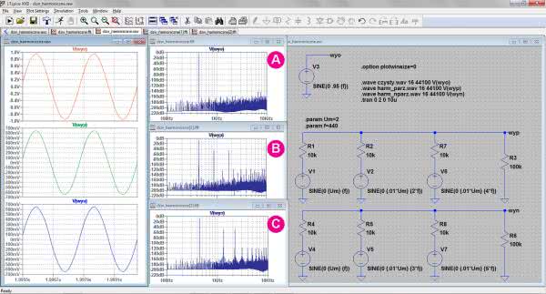 Aby przekonać się jak osobiście odczuwamy obecność harmonicznych w odsłuchiwanych dźwiękach wykonamy symulację, w której wygenerujemy ton a-razkreślne (440 Hz), do którego są strojone instrumenty w orkiestrach symfonicznych. Dodamy też dwa identyczne generatory, których dźwięki zostaną wzbogacone o dwie harmoniczne. W pierwszym przypadku będą to harmoniczne 2. i 4. o amplitudach równych 1% amplitudy dźwięku podstawowego, w drugim będą to harmoniczne 3. i 5. o takich samych amplitudach jak dla harmonicznych parzystych. Harmoniczne parzyste są sumowane z sygnałem podstawowym na rezystorze R3, a kompletny przebieg jest wyprowadzony na wyjście „wyp”. Dla harmonicznych nieparzystych są to odpowiednio rezystor R5 i wyjście „wyn”. Czysty przebieg jest dostępny na wyjściu „wyo” (rysunek 1).