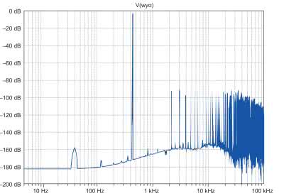 Do widocznych na rysunku w wykresów czasowych dodano wykresy FFT przedstawiające widmo każdego z trzech sygnałów. Wykres taki jest tworzony przez kliknięcie prawym przyciskiem myszki na danym wykresie czasowym i wybraniu opcji: View → FFT. Przyjmujemy parametry domyślne proponowane przez symulator. Uruchamiając symulację czasową .TRAN z jej domyślnymi parametrami może okazać się, że widmo będzie miało wysoko umieszczoną podłogę szumów, pojawią się w nim ponadto składniki, których raczej być nie powinno (rysunek 2).
