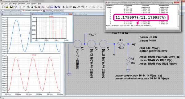 Na rysunku 3 pokazano schemat układu testowego. Źródło napięciowe V1 generuje składową podstawową o częstotliwości 440 Hz i amplitudzie 0,707 V. Harmoniczne są generowane przez źródła V2 (druga) i V3 (siódma). Sygnały akustyczne są tworzone znaną już instrukcją .WAVE. Zawsze generujemy ton o częstotliwości podstawowej, który jest dostępny na wyjściu „wy_cz”, natomiast sygnał z harmonicznymi występuje na wyjściu „wy”. Dzielnik napięciowy R1 i R2 dobrano tak, aby napięcie skuteczne sygnału zawierającego harmoniczne było takie samo jak sygnału bez harmonicznych. Poziomy napięć są mierzone instrukcjami .MEAS. Na wykresach czasowych przedstawiono przebieg oryginalny i zniekształcony, dodatkowo dodano wykres widma. Do zmierzenia współczynnika THD zastosowano instrukcję .FOUR. Jej wyniki oglądamy w oknie „SPICE Error Log” i jak widać są one zgodne z przewidywanymi teoretycznie, obliczonymi z zależności (1). W oknie wyników dostrzegamy jeszcze jedną wartość podaną w nawiasie. Jest to też parametr często podawany w specyfikacjach technicznych, w którym do wartości skutecznych wszystkich harmonicznych dodawane jest skuteczne napięcie szumów. Wszystko jest odnoszone do napięcia skutecznego częstotliwości podstawowej. Współczynnik ten jest oznaczany THD+N i jest opisany wzorem:
