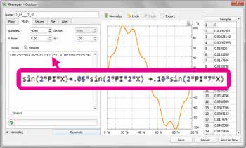 Podobną ocenę przeprowadzimy teraz odsłuchując sygnały generowane przez Analog Discovery 2. Użyjemy do tego pierwszego kanału generatora arbitralnego. Powstaje pytanie, jak zmusić urządzenie do tego, by generowało dokładnie takie same przebiegi jak w symulacji? W tym celu wybieramy tryb pracy generatora „Custom” i przystępujemy do definiowania własnego przebiegu naciskając ikonkę „New”. Otwiera się okno edytora przebiegu, w którym wybieramy zakładkę „Math”, co oznacza, że przebieg utworzymy opisując go wyrażeniem matematycznym (rysunek 4).