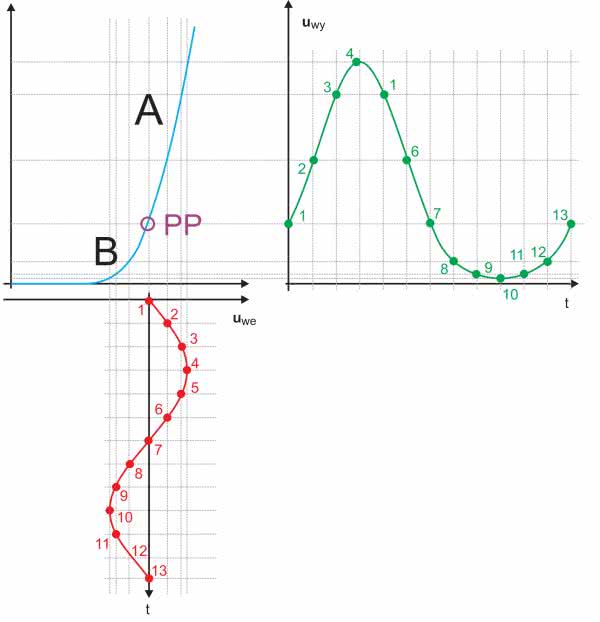 Widzimy na nim charakterystykę elementu wzmacniającego (np. tranzystora lub lampy) z zaznaczono punktem pracy „PP”. Jest on ustawiony na pograniczu odcinka, który można w przybliżeniu uznać za liniowy (A) i kolana charakterystyki (B). Taki dobór punktu pracy powoduje, że wzmocniony sygnał wyjściowy (krzywa zielona) jest bardzo zniekształcony. Przedstawiony tu przypadek jest mocno przerysowany. Zabieg ten zastosowano, aby wyraźnie zilustrować mechanizm powstawania zniekształceń. Jak widać, górna połówka sinusoidy wzmacniana na liniowym odcinku charakterystyki pozostaje prawie niezniekształcona, dolna natomiast uległa znacznej deformacji. Przebieg wyjściowy nie jest więc już sinusoidą, a jedynie przebiegiem odkształconym. Z teorii Fouriera wiemy, że muszą pojawić się w nim harmoniczne.