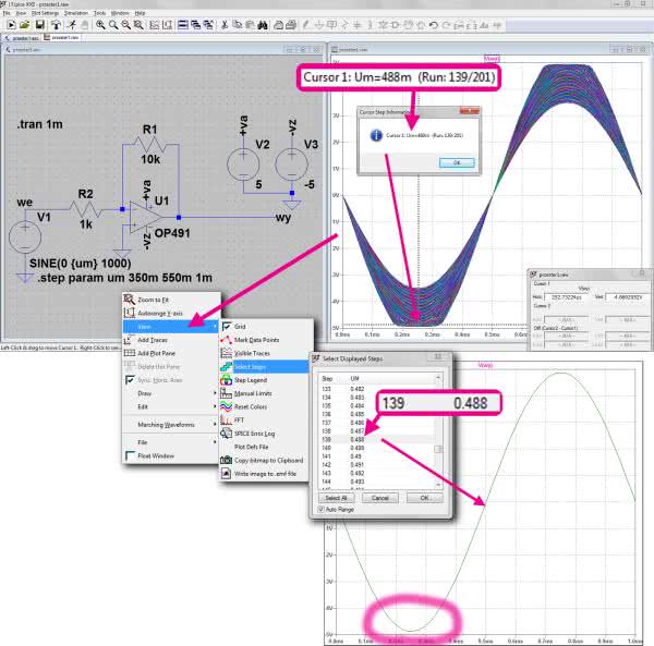 co oznacza, że amplituda będzie się zmieniała od 350 mV do 550 mV co 1 mV. Pamiętajmy, że w symulatorze podajemy amplitudę, nie wartość międzyszczytową. Zastosujemy symulację .TRAN 1m, która obejmie dokładne jeden okres przebiegu. W celu określenia maksymalnej amplitudy wejściowej ustawiamy kursor na wykresie w pozycji minimum sygnału, naciskamy prawy przycisk myszki i używając kursorów „góra”, „dół” wybieramy ten przebieg, który wydaje się pierwszym zniekształconym. Nie jest to zadanie łatwe, a odpowiedź nie jest jednoznaczna i przesądzająca. Według mnie krytyczna amplituda to ok. 488 mV. Aby zobaczyć jak wygląda przebieg odpowiadający Uwe=488 mV możemy go wyodrębnić klikając prawym przyciskiem myszki na wykresie, a następnie wybrać opcje: View → Select Steps i z wyświetlonego zestawu zaznaczyć pozycję odpowiadającą 488 mV. Na wykresie pozostanie tylko jedna sinusoida, której można dokładniej się przyjrzeć. Dostrzegamy minimalne zniekształcenie dolnego fragmentu przebiegu, w samym minimum, ale jest ono bardzo subtelne.