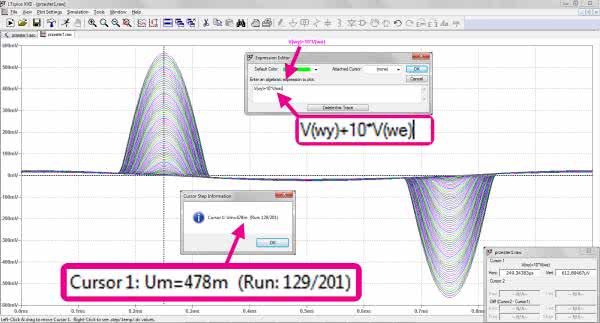 W przypadku liniowej pracy wzmacniacza różnica ta powinna być stała, jednak już przy minimalnym przesterowaniu ujawniają się zmiany. Metoda diagnozowanie krytycznego napięcia wejściowego jest podobna jak w poprzednim przykładzie. Przyjmujemy zmiany napięcia wejściowego w zakresie od 350 mV do 550 mV z krokiem 1 mV i obserwujemy zależność V(wy)+10·V(we). Ustawiamy kursor np. w punkcie odpowiadającemu maksimum wykresu i za pomocą kursorów „góra”, „dół” znajdujemy ten krok, w którym uwidacznia się wyraźny skok wskazywanej wartości.
