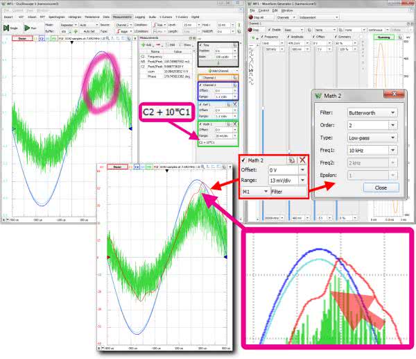 Nie zapomnijmy wskazać sygnału filtrowanego. Będzie nim oczywiście „M1”, a więc sygnał z kanału „Math 1”. Teraz już bardzo dobrze widoczny jest artefakt ujawniający się w stanie przesterowania.