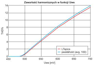Sprawdźmy, jakim wartościom THD odpowiadają wykryte dwiema metodami stany wejścia w przesterowanie. Parametr THD jest obliczany w programie Ltspice funkcją .FOUR. Ważne jest zadbanie o jak największą dokładność obliczeń, co zapewni odpowiednią czystość widma.