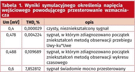 Podsumowując: czas analizy jest równy 0,1 s, parametr „Maximum Timestep”=0,1 ms, wyłączona kompresja danych, analiza sygnału o częstotliwości 1 kHz obserwowanego na wyjściu układu. Uwzględniamy 4 przebiegi o amplitudach 400 mV, 478 mV, 488 mV i 500 mV. Sygnał 400-miliwoltowy powinien być czysty, gdyż mieści się w liniowym zakresie pracy wzmacniacza, sygnał 478 mV to ten, który uznaliśmy jako graniczny w drugiej, bardziej precyzyjnej metodzie. Sygnał 488 mV wybraliśmy jako graniczny na podstawie obserwacji wykresu czasowego, natomiast sygnał o amplitudzie 600 mV powinien już czysto teoretycznie przesterować wzmacniacz. Zwiększyliśmy ponadto liczbę analizowanych harmonicznych do 15. Przyjęte opcje powodują znaczne spowolnienie pracy symulatora, ale jest to cena za uzyskanie dużej dokładności obliczeń.