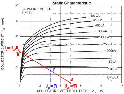 Łączy ona punkt A (UCC na osi poziomej) z punktem B (UCC/RC na osi pionowej). Punkt B odpowiada prądowi, jaki popłynąłby przez kolektor tranzystora i rezystor obciążenia w stanie idealnego nasycenia (UCE=0). Punkt pracy P wybieramy zwykle w środku liniowego zakresu charakterystyk, co w przybliżeniu odpowiada połowie napięcia zasilającego. Z wykresu IC=f(UCE) można odczytać, jaki będzie spoczynkowy prąd kolektora i odpowiadający mu prąd bazy. Zwróćmy uwagę na to, że prosta obciążenia zawsze będzie wychodziła z punktu UCC (A), a jej nachylenie względem osi poziomej będzie rosło wraz ze zmniejszaniem się rezystancji obciążenia RC.