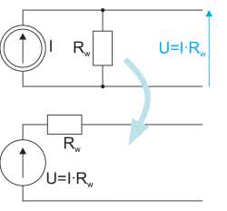 Źródło prądowe musimy zaimplementować sami. Jak wiadomo, idealne źródło prądowe charakteryzuje się nieskończenie dużą rezystancją wewnętrzną. Z oczywistych powodów realizacja takiego źródła nie jest możliwa. Przyjmijmy, że rezystancja 20 kΩ będzie wystarczająca. Z teorii obwodów wiemy, że nieidealne źródło prądowe można zastąpić źródłem napięciowym o rezystancji szeregowej równej rezystancji równoległej źródła prądowego. Napięcie źródła zastępczego jest równe napięciu, jakie występuje na rezystancji równoległej nieobciążonego źródła prądowego.