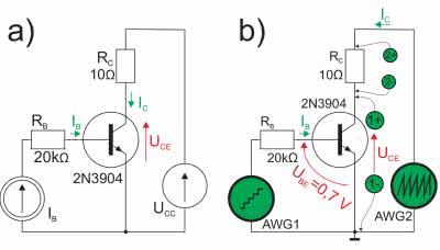 Urządzenie to ma dwa kanały generatora arbitralnego, które można traktować jak źródła napięciowe. Jest to bardzo przydatna cecha do zasilania kolektora, pozostaje jedynie problem pomiaru prądu. Jak zwykle rozwiązujemy go metodą pomiaru napięcia na znanym rezystorze. Aby nie zaburzał on warunków pomiarowych, musi mieć małą rezystancję, na tyle jednak dużą, aby możliwy był pomiar spadku napięcia na nim. Z doświadczenia wiemy, że względnie dobre wyniki uzyskuje się dla rezystancji 10 Ω.