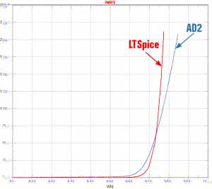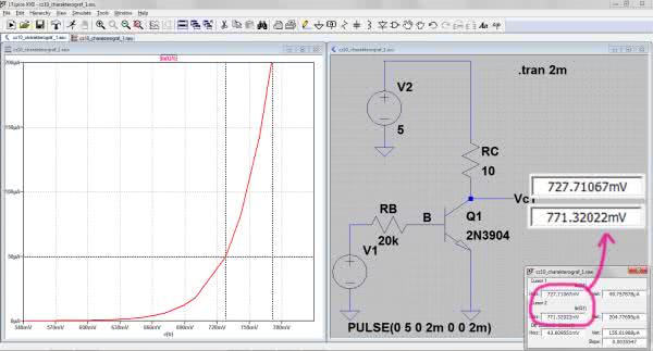 Źródło V1 generuje przebieg napięciowy narastający liniowo w zakresie od 0 do 5 woltów w czasie 2 milisekund. Uruchamiamy symulację .TRAN 2m (plik Ib(Ube).asc dostępny w materiałach dodatkowych). Jako przebieg rysowany na wykresie wskazujemy prąd bazy tranzystora Q1 (Ib(Q1)). Nie interesuje nas jednak wykres czasowy. Klikając prawym przyciskiem myszki na opisie osi poziomej uruchamiamy okno, w którym zmieniamy pole „Quantity Plotted” na V(b). Tym samym tworzymy wykres IB=f(UBE). Teraz możemy już ustawić dwa kursory w pozycjach odpowiadających prądom 50 μA i 200 μA, a następnie odczytać odpowiadające im napięcia UBE. Okazuje się, że napięcie UBE zmienia się od 0,728 V do 0,771 V, czyli o ok. 50 mV. Z ciekawości wykonałem podobny pomiar w układzie rzeczywistym i niestety okazało się, że charakterystyki różnią się dość znacznie (rysunek 6).