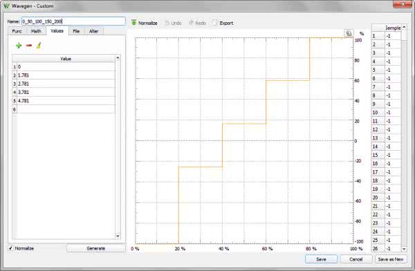 Na szczęście zmieściliśmy się w zakresie napięć wyjściowych generatora arbitralnego Analog Discovery 2 (max. 5 V). Możemy przystąpić do definiowania przebiegu schodkowego. W tym celu uruchamiamy w programie WaveForms generator arbitralny i w kanale 1. wybieramy opcję „Custom → New”. Z kilku dostępnych metod projektowania przebiegu wybieramy „Values”, która pozwoli zdefiniować przebieg na podstawie wcześniejszych obliczeń. W tabelce zapisujemy więc kolejne wartości, a następnie generujemy przebieg z włączoną opcją Normalize naciskając przycisk ekranowy Generate.