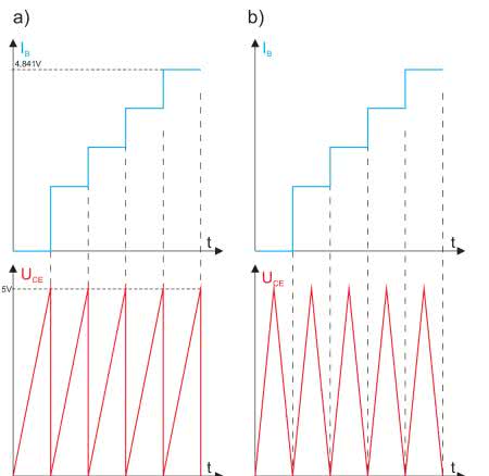 Ponieważ mamy 5 wartości prądu bazy i dla każdego musi wystąpić pełna zmiana napięcia UCE, częstotliwość przebiegu generowanego w 2. kanale generatora musi być 5-krotnie większa od przebiegu z kanału 1. Napięcie UCE musi zmieniać się liniowo, więc wybieramy przebieg piłokształtny.