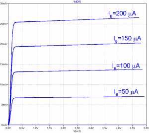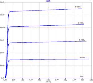 Okazuje się, że beta naszego tranzystora mierzona miernikiem jest mniejsza nawet od katalogowej i równa 131. Różnice są znaczne i nie wiadomo, czy bardziej wierzyć katalogowi, czy symulatorowi. Należy tylko dodać, że niełatwo jest znaleźć w sieci notę katalogową tranzystora 2N3904 zawierającą charakterystykę IC=f(UCE). Zobaczmy więc, jak wyglądałaby zdjęta w programie LTspice charakterystyka IC=f(UCE) tranzystora z hFE=131. Porównamy ją później z pomiarem tranzystora rzeczywistego.