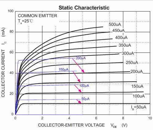 Przydatna może być do tego znajomość charakterystyki IC=f(UCE). Właściwie jest to rodzina charakterystyk opisujących prąd kolektora w funkcji napięcia baza-kolektor dla różnych prądów bazy. Na takim wykresie (rysunek 1) zaznaczamy napięcie zasilające, a następnie wrysowujemy tzw. prostą obciążenia.