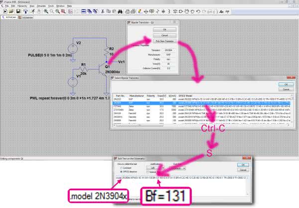 W wyświetlonym oknie mamy zaznaczone dane tranzystora 2N3904. Wzmocnienie prądowe jest oznaczone symbolem Bf i jest równe 300, a więc tak jak je oszacowaliśmy z otrzymanych charakterystyk. Niestety, parametrów bibliotecznych nie można zmieniać bez ingerencji w samą bibliotekę. Skopiujemy więc podświetlone informacje do pamięci podręcznej (Ctrl-C), a następnie wkleimy je do okna poleceń wywołanego w edytorze LTspice naciśnięciem klawisza S. Po wklejeniu danych z pamięci podręcznej (Ctrl-V) zmiany są już możliwe. Nadajemy parametrowi Bf wartość 131, ale konieczna jest również zmiana typu tranzystora. Gdybyśmy tego nie zrobili, wystąpiłby konflikt uniemożliwiający symulację. Dopisujemy więc literkę np. „x” do typu tranzystora i akceptujemy wszystkie zmiany.