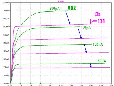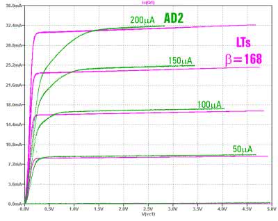 Wyglądają pięknie, ale nasz zachwyt maleje, gdy porównamy je z charakterystykami katalogowymi (rysunek 11). Już na pierwszy rzut oka widać, że w symulatorze przyjęto dużo większe wzmocnienie prądowe hFE (beta). Z szacunków wynika, że wynosi ono ok. 300, podczas gdy tranzystor katalogowy ma ok. 200.