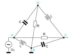 Wszystkie boki tej piramidy mają kształt trójkąta, a każdy z nich zawiera trzy różne elementy. Dla uproszczenia obliczeń przyjmujemy, że elementy poszczególnych typów mają równe wartości, i tak: R=1 Ω, L=4,5 μH i C=100 nF.