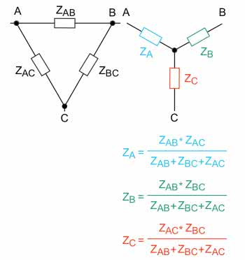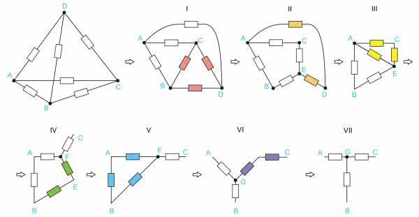 Układ jest na pierwszy rzut oka dość nieprzyjemny do obliczeń. Z każdego węzła odchodzą 3 rozgałęzienia, nie da się więc go zwinąć prostymi metodami. Obecność trójkątów nasuwa pomysł, aby skorzystać z przekształceń trójkąt-gwiazda. Zasadę tę pokazano na rysunku 2, a na rysunku 3 widoczne są kolejne etapy zwijania obwodu. No cóż, do uzyskania końcowego obwodu, z którego już bez większego problemu będzie możliwe obliczenie transmitancji wymaga wykonania aż 7 kroków. Gdyby piramida składała się z samych rezystorów można by ewentualnie zdecydować się na taką metodę obliczeń, my mamy jednak elementy R, L i C, więc obliczenia znacznie się skomplikują.