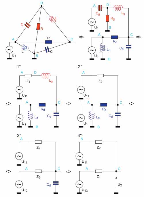 Do dalszych obliczeń konieczne jest jeszcze kolejne zwinięcie obwodu dolnego. W kroku 4° tworzymy więc źródło zastępcze składające się z elementów U12, Z3 i Cd. Napięcie U13 jest równe: