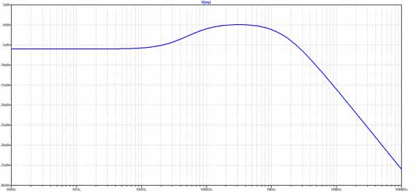Taka postać transmitancji pozwala już powiedzieć niemal wszystko o naszej piramidzie. Po pierwsze, dla prądu stałego i małych częstotliwości transmitancja jest równa 1/2 (–6 dB), wiec na wyjściu wystąpi połowa napięcia wejściowego. Po drugie, mamy jedno zero i dwa bieguny, więc charakterystyka amplitudowa będzie miała jedno zagięcie do góry i dwa zagięcia na dół. Każde zagięcie powoduje zmianę nachylenia charakterystyki amplitudowej o 20 dB/dek do góry a dla zera tyle samo na dół. W szczególnym przypadku może wystąpić jeden podwójny biegun dla którego charakterystyka zagnie się o 40 dB/dek na dół. Będzie to zależało od wartości elementów. Warto więc sprawdzić jak wygląda charakterystyka naszego fizycznego układu.