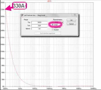 Tu niestety czeka nas przykra niespodzianka. Weryfikacji pomiarowej tym razem nie będzie. Dlaczego? Sprawdźmy, jaki będzie prąd pobierany ze źródła wejściowego w symulacji AC Analysis? Powracamy do schematu pomiarowego z rysunku 9, z tym że zamiast na wyjście klikamy na źródło V1. Uzyskujemy tym samym charakterystykę poboru prądu w funkcji częstotliwości, ale nie interesują nas zmiany względne, tylko wartości bezwzględne. Dlatego zmieniamy skalę pionową wykresu klikając na nią, a następnie wybierając opcję „Linear” (rysunek 11). Wszystko staje się jasne. Dla niskich częstotliwości prąd pobierany ze źródła V1 musiałby mieć natężenie rzędu dziesiątek, a nawet setek amperów (maksimum 330 A).