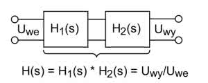 Jest ona równa iloczynowi transmitancji poszczególnych czwórników. Dla układu z rysunku 12 transmitancja wypadkowa będzie równa H(s)=H1(s)*H2(s). Ale uwaga: transmitancja każdego czwórnika jest liczona przy założeniu, że nie jest on niczym obciążony. W układzie z rysunku 12 oznacza to, że oporność wejściowa czwórnika o transmitancji H2(s) musi być wielokrotnie wyższa niż oporność wyjściowa poprzedzającego czwórnika H1(s).